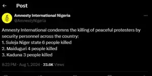 Amnesty International reported that six protesters were killed in Suleja, Niger state; four in Maiduguri, Borno state; and three in Kaduna.