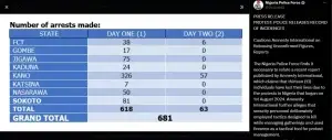 The statement also noted that the Police had made 681 arrests, alleging that those arrested were criminals who perpetuated arson, robbery, and looting, among other crimes.