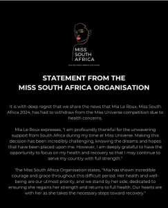 The Miss South Africa organisation emphasised its unwavering support for Le Roux, stating, “Her health and well-being are our utmost priority. Our hearts are with her as she takes the necessary steps toward recovery.”