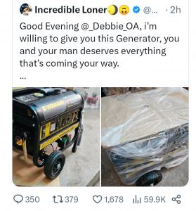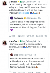 Kuda Bank joined the merry party by adding ₦2 000 000 to her already robust account balance. The Nigerian National Petroleum Corporation (NNPC) Ltd. was not to be left out. The oil firm tweeted: “Hello @_Debbie_OA, we love your amazing love story. And we would like to gift you a free ₦200,000 PMS voucher. (It is) redeemable at any of our 900+ retail stations nationwide.”