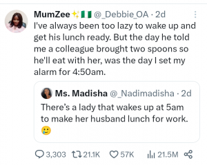 The seemingly mundane revelation sparked a divided response from netizens, with debates flying sky-high about the wisdom of waking up at dawn to cook for a partner. The arguments heightened when netizens found out that she was pregnant. While some criticized the perceived inconvenience and labelled it as “subjecting to and glorifying slavery,” others praised her dedication. Still, others accused her of being insecure and commented on the absurdity of her intentions.