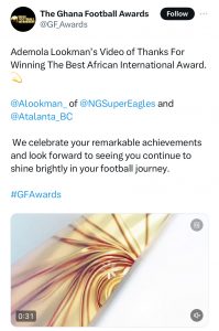 In a video posted online, Lookman sent an appreciation message to the voters and organisers, saying, “I just want to thank you so much for the consideration, the recognition, and the votes. This means so much to me, my family, and my football. I wish I were in Ghana, but my heart is with you guys. Thank you, and God bless always.”