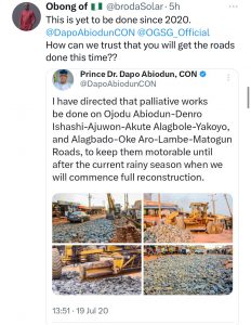 This move came after a wave of complaints under the hashtag #DapoFixOgunRoad on X. These complaints included the lousy state of the roads within the state, including those that had become impassable due to flooding.