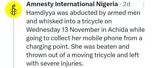 The rights group also detailed an incident of Hamdiyya’s abduction on November 13. According to their statement, she was attacked after visiting a local charging station, beaten, and thrown from a moving tricycle, leaving her with severe injuries.
