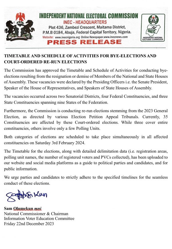 In a statement signed by the INEC National Commissioner and Chairman of the Information Voter Education Committee, Sam Olumekun, on Friday, December 22,...