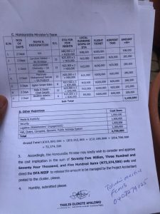 The minister’s advanced team members: Hon Thalis Olonite Apalowo (NPM, GVG), Mrs Oniyelu Bridget Mojisola (Project Accountant), Ibrahim Adamu (Department of State Services), Adejumo Olusegun Agbailu (TTL, GVG)), Mr Iyanda Abiodun (Protocol Officer), Chime Jessica Ginika (ONPM), and Salami Surajudeen Ojo (Driver) received N200,000 for a flight ticket and N20,000 for an airport taxi, totalling N1.54 million.