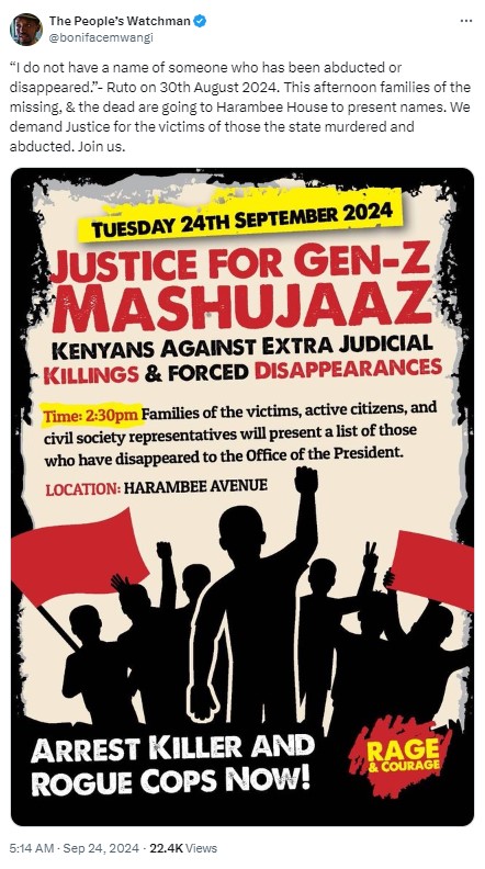 Mwangi further wrote that he would be presenting the names of those killed and the families of those who are still missing at the Harambee House.