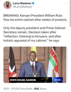Breaking: Kenya President Ruto Fires Entire Cabinet