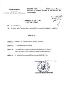 Burkina Faso’s military leader, Captain Ibrahim Traoré, has dismissed Interim Prime Minister Apollinaire Joachim Kyelem de Tambela and dissolved the country’s government, according to a decree issued by his office on Friday.