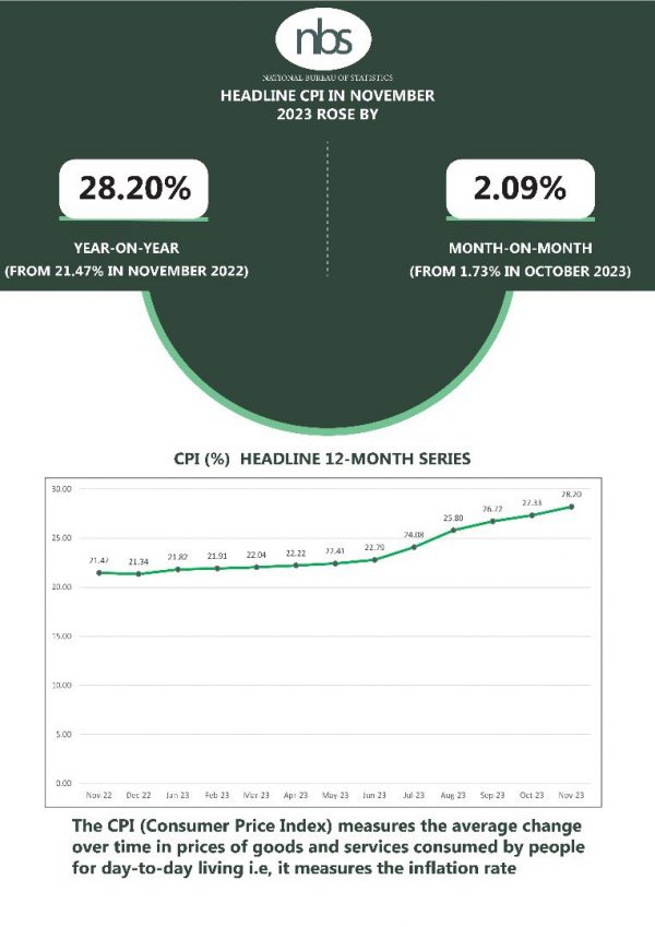 ByIkenna ChurchillDecember 18, 2023Nigeria’s economic landscape faced an intensified challenge as November 2023 witnessed a surge in headline inflation, reaching a staggering 28.20%. Data released by...