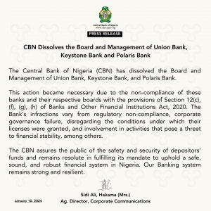 As a result of the dissolution, the CBN has appointed new executives to oversee the bank’s affairs. Yetunde Oni is appointed Managing Director/CEO of Union Bank, with Mannir Ubali Ringim as Executive Director. Keystone Bank sees Hassan Imam taking the role of Managing Director/CEO, accompanied by Chioma A. Mang as Executive Director. Polaris Bank’s new leadership comprises Lawal Mudathir Omokayode Akintola as Managing Director/CEO and Chris Onyeka Ofikulu as Executive Director.