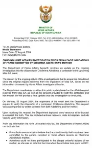 Further, the South African Department of Home Affairs investigated Adetshina’s citizenship status. According to a gazette released by the department, there is preliminary evidence suggesting that her mother may have committed identity theft, potentially affecting Adetshina’s eligibility to participate in the contest.