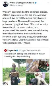 The Nigerian police has said it cannot apprehend all criminals at once. The force Public Relationship Officer Olumuyiwa Adejobi said this while responding to a post on X (formerly Twitter) by Zagazola, which showed bandits and kidnappers posing with ransom money.