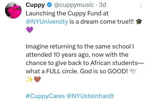 In addition to her role at UNGA, DJ Cuppy launched the “Cuppy Fund” at New York University (NYU) on September 19 to support African students studying abroad. The singer, who has an impressive academic background with four degrees from King’s College London, New York University, University of Oxford, and London School of Economics, expressed her excitement at the opportunity to give back to African students.