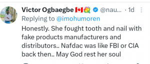 “Sadly, she died because she was so engrossed in her work for NAFDAC that she delayed her fibroid hysterectomy for years, which later was found to be cancerous.