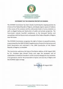 According to the statement, ECOWAS has been following the developments, with such sad news of some protesters’ deaths and destruction of public and private properties.