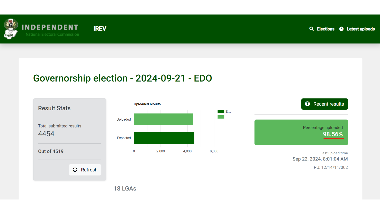 The Independent National Electoral Commission (INEC) has uploaded 98.56 per cent of polling unit results of the Edo governorship election on the result viewing portal (IReV).