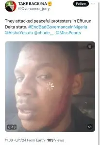 Peaceful #EndBadGovernance protesters in Effurun, Delta State, were attacked today as part of the ongoing protests across the country. The protesters, expressing their frustration over hunger, economic hardship, and governance issues, were attacked by thugs.