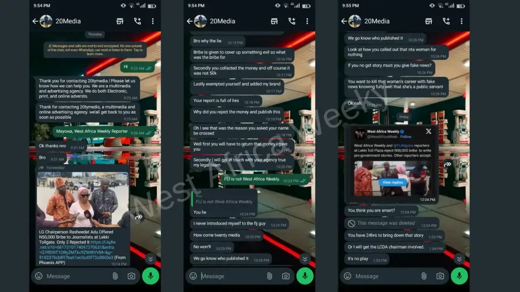 In response to the recent West Africa Weekly report on the N50,000 bribe offered to journalists covering the #EndBadGovernance protests at the Lekki Toll Plaza in Lagos on August 1st, 2024, a supposed freelance journalist, identified as Bob of Twenty20 Media Limited has threatened to file a lawsuit and “involve” Rasheedat Abiodun Adu, the Chairperson of Iru-Victoria Island Local Council Development Area (LCDA).