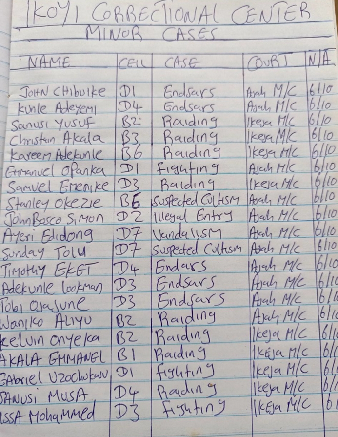 Twenty #EndSARS protesters in Ikoyi Correctional Centre with minor cases – John Chibuke (Cell D1: #EndSARS: Ajah Magistrate Court: 6/10), Kunle Adeyemi (Cell D4: #EndSARS Ajah Magistrate Court: 6/10), Sanusi Yusuf (Cell B2: Raiding -Ikeja Magistrate Court: 6/10), Christian Akala (Cell B3: Raiding – Ikeja Magistrate Court: 6/10), Kareem Adekunle (Cell B6: Raiding – Ikeja Magistrate Court: 6/10), Emmanuel Opanka (Cell D1: Fighting – Ajah Magistrate Court: 6/10), Samuel Emenike (Cell D3: Raiding – Ikeja Magistrate Court: 6/10), JohnBosco Simon (Cell D2: Illegal Entry – Ajah Magistrate Court: 6/10), Ayeri Edidong (Cell D7: Vandalism – Ajah Magistrate Court: 6/10), Sunday Tolu (Cell D7: Suspected Cultist – Ajah Magistrate Court: 6/10).
