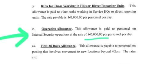 Meanwhile, the Manual of Financial Administration for the Armed Forces of Nigeria (2017) stated that any personnel deployed must receive an operation allowance for internal security operations at N5,000 per day.