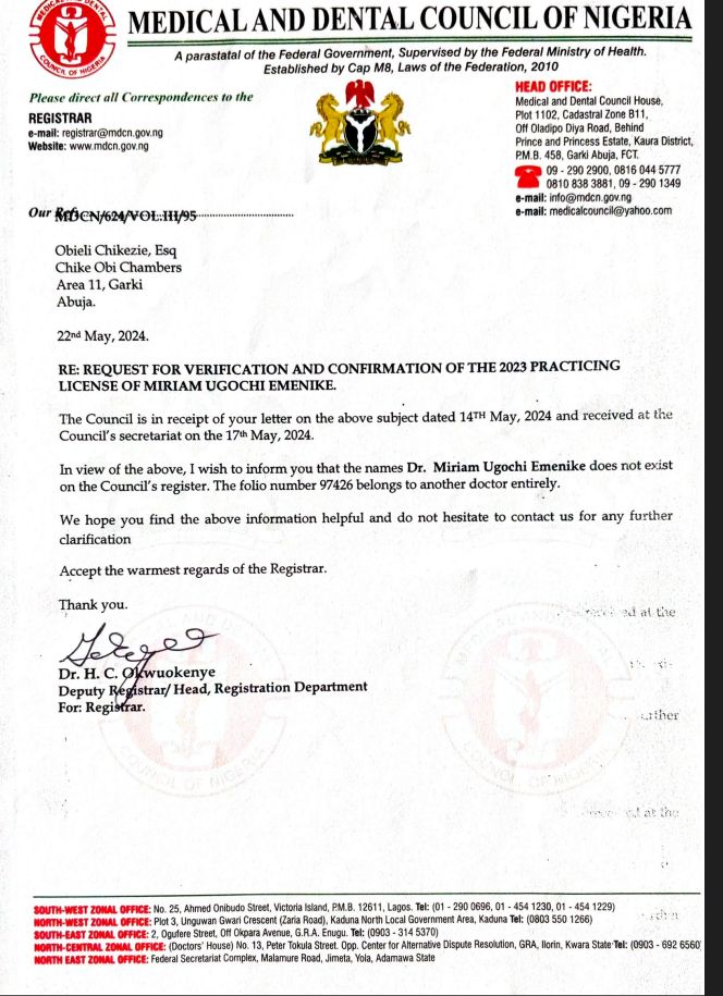 The MDCN’s investigation confirmed that Emenike’s name does not appear in its registry of licensed medical practitioners. Additionally, the folio number she used to obtain her position reportedly belongs to another doctor.
