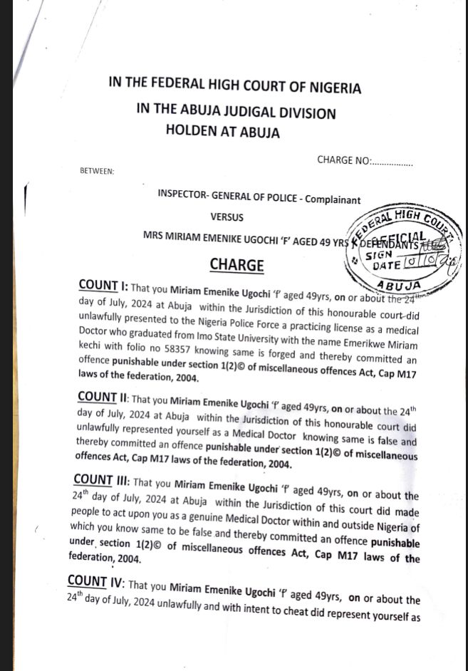 According to court records from the Federal High Court in Abuja, Miriam Ugochi Emenike has been charged with forgery, impersonation, and obtaining employment under false pretences.