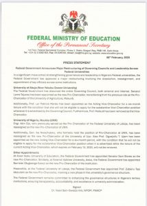 The Nigerian Federal Government has announced the dissolution of several governing councils and the reassignment of key officials in some federal universities. This was revealed in a press statement issued by the Federal Ministry of Education on February 6, 2025.