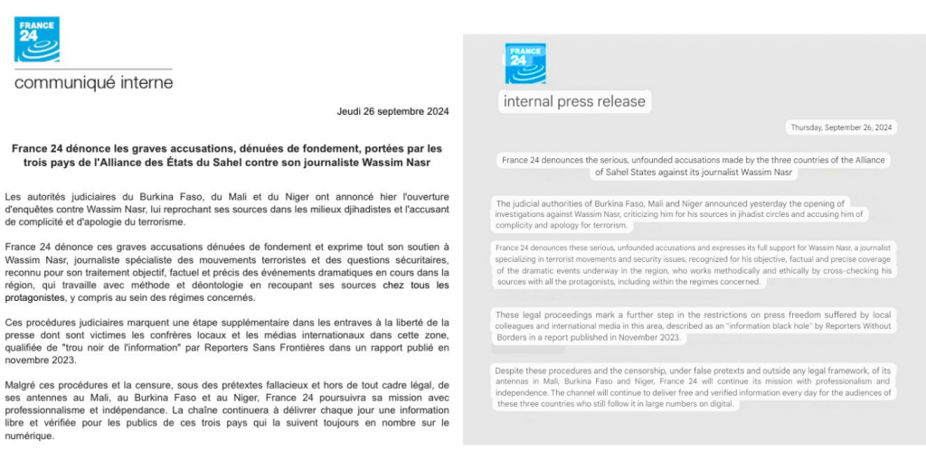 On Thursday, September 26, France24 issued a press release denouncing the allegations laid against its employee by the AES, which consists of Mali, Burkina Faso, and Niger. This is despite the fact that France24 had been accused of hosting an alleged terrorist, Attaye Ag Mohamed, known as the vice president for external relations of CSP-DPA.