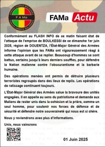Praising the bravery and resilience of the deployed troops, the Chief of the General Staff called on all military personnel to maintain their vigilance and continue operations until complete victory is achieved. He reaffirmed the army’s commitment to defending the Malian population and securing national territory from extremist threats.