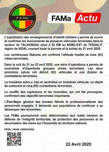 The Malian Armed Forces (FAMa) have intensified their counter-terror operations near the Algerian border, targeting terrorist groups in the Talhandak area, approximately 82 kilometres northeast of Tessalit in the Kidal region.