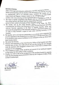 Pledging unwavering support to the Association of Resident Doctors, Federal Teaching Hospital Lokoja (ARDFTHL), the SOC urged them to address issues raised in the aftermath.