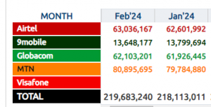 In February, MTN gained 1.1 million new subscriptions, bringing its total to 80.9 million. Airtel also increased, adding 434,175 new subscriptions and pushing its database to 63 million. Globacom experienced a slight uptick with 176,756 new subscriptions, totalling 62.1 million.