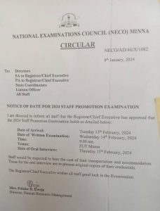 The National Examination Council, NECO, has directed all staff eligible for promotion to head to Minna, Niger State, for their 2024 promotional exams amidst rising security concerns.