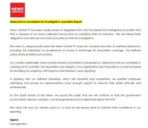 News Central TV says it has launched an internal investigation into FIJ’s report indicating one of its reporters was among the journalists offered a N50,000 bribe to share at the Lekki Toll Plaza during the #EndBadGovernance protest on Thursday.