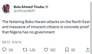 In the years before his presidency, Bola Tinubu was vocal about the threat of Boko Haram and the failure of the Nigerian government to address rising insecurity. From 2014 through 2017, he made several posts on the country’s deteriorating security. He tweeted about the carnage in the Northeast, condemning the Jonathan administration for its inability to protect citizens.