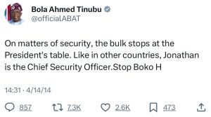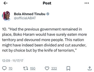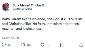In the years before his presidency, Bola Tinubu was vocal about the threat of Boko Haram and the failure of the Nigerian government to address rising insecurity. From 2014 through 2017, he made several posts on the country’s deteriorating security. He tweeted about the carnage in the Northeast, condemning the Jonathan administration for its inability to protect citizens.