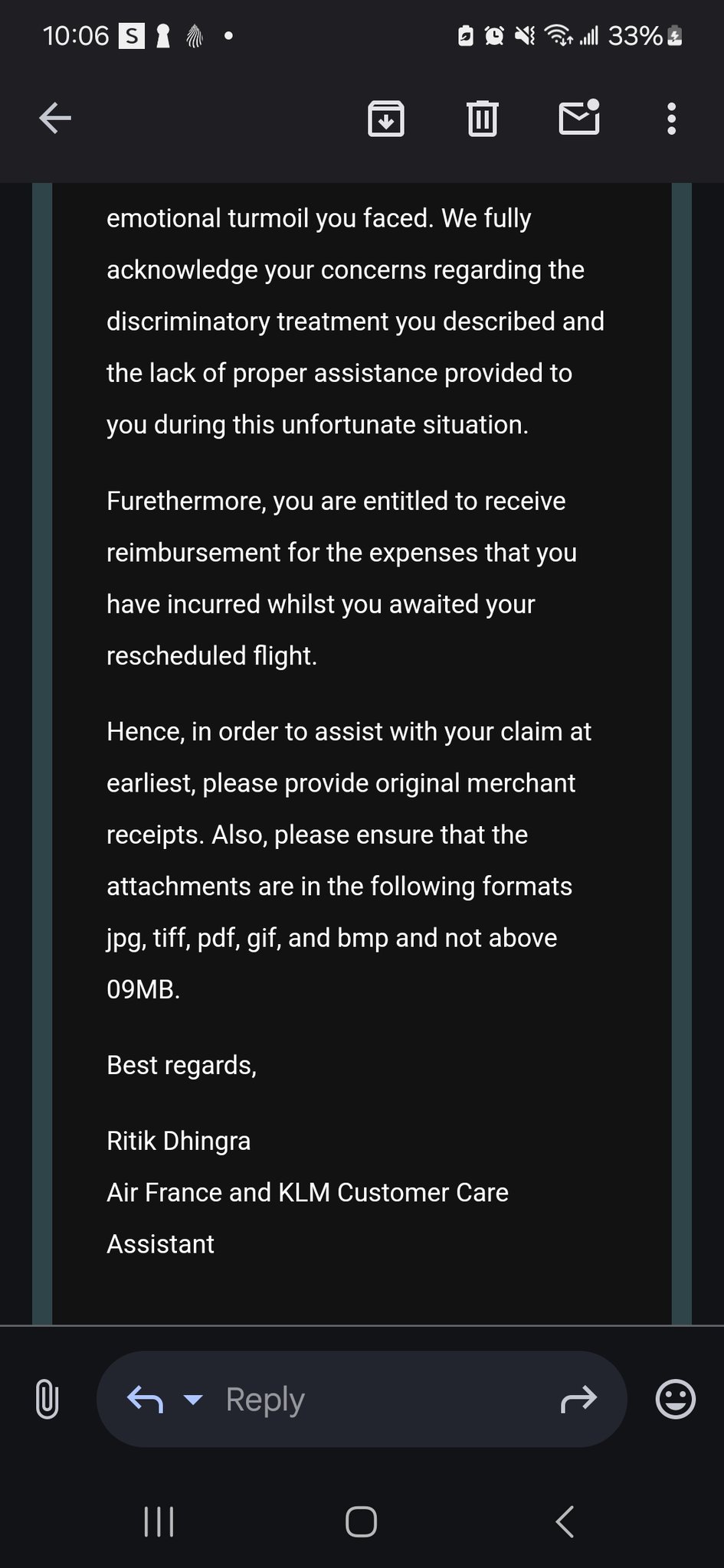 Omoologo said Air France, through Customer Care Assistant Ritik Dhingra, admitted the flight was cancelled due to weather (de-icing), as she had narrated. However, the airline claimed weather issues exempted them from providing extra compensation. Speaking to West Africa Weekly, Omoologo said the airline asked her to submit original receipts for reimbursement of expenses incurred while waiting for her rescheduled flight to Newcastle. However, they excluded her Paris hotel costs and failed to address her claims of discriminatory treatment by their staff.