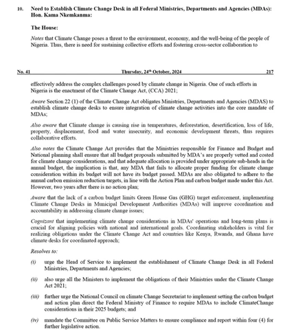 Furthermore, the House urged the National Council on Climate Change Secretariat to set up a carbon budget and action plan, directing the Federal Ministry of Finance to require MDAs to include climate considerations in their 2025 budgets.