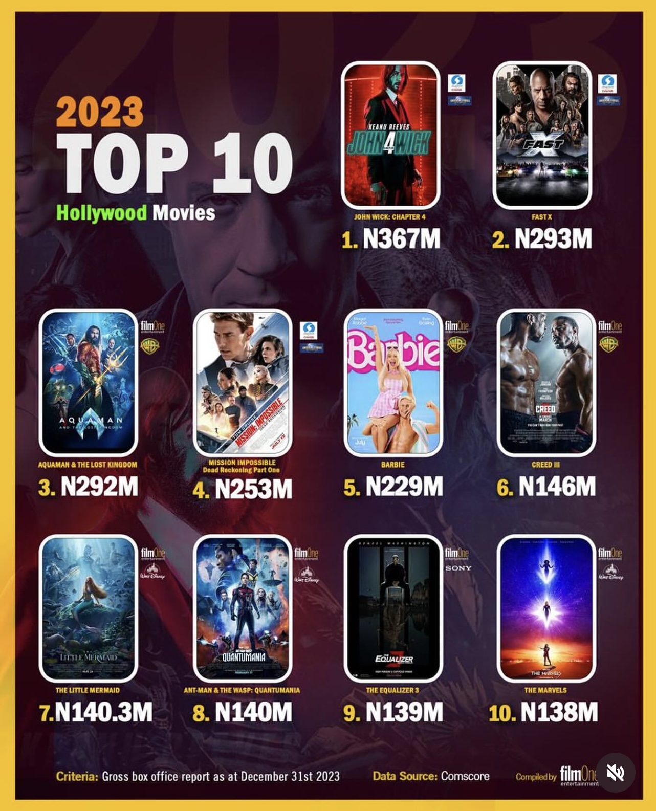 FilmOne released its annual roundup of the highest-grossing films from the previous year, spotlighting both Nollywood and Hollywood hits. Topping the list for Nollywood were titles like “A Tribe Called Judah” and “Malaika,” while Hollywood boasted blockbusters such as “John Wick: Chapter 4” and “Aquaman and the Lost Kingdom.”