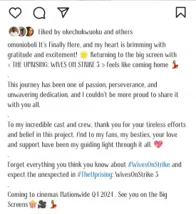 Filmmaker Omoni Oboli has announced the return of her acclaimed film series with a new spinoff titled The Uprising: Wives on Strike 3, set to hit theatres in the fourth quarter of 2024. The announcement was made via an Instagram post on Wednesday, July 10, 2024, where Oboli expressed her excitement and gratitude for the continuation of the series.
