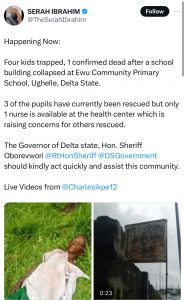 The collapsed of a section of Ewu Community Primary School in Ughelli, Delta State has left one pupil dead and three others were rescued in a delicate operation.