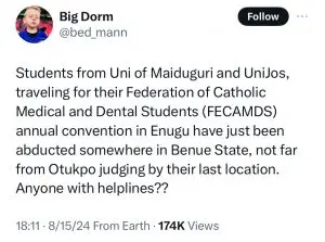 In a post, the account wrote: “A House Officer (Dr Louis) and 20+ Medical and Dental students have reportedly been kidnapped! These students, from the University of Maiduguri and the University of Jos, were travelling for their Federation of Catholic Medical and Dental Students (FECAMDS) annual convention in Enugu. They were reportedly abducted somewhere in Benue State, not far from Otukpo, judging by their last known location. We plead for your urgent intervention.”