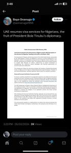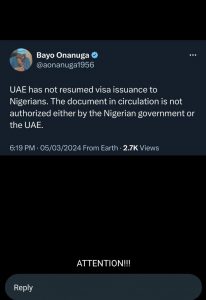 Yesterday, March 5, 2024, a viral announcement claimed that the UAE had lifted the visa ban on Nigerians.  This time, the announcement was posted on the official X page of the Special Adviser to President Bola Tinubu on Information, Bayo Onanuga.