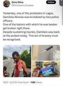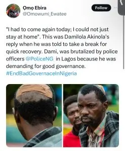 Eyewitnesses posted on X about using excessive force to disperse the protesters. The injuries Akinola sustained were significant, leaving him with visible wounds and in need of immediate medical attention.