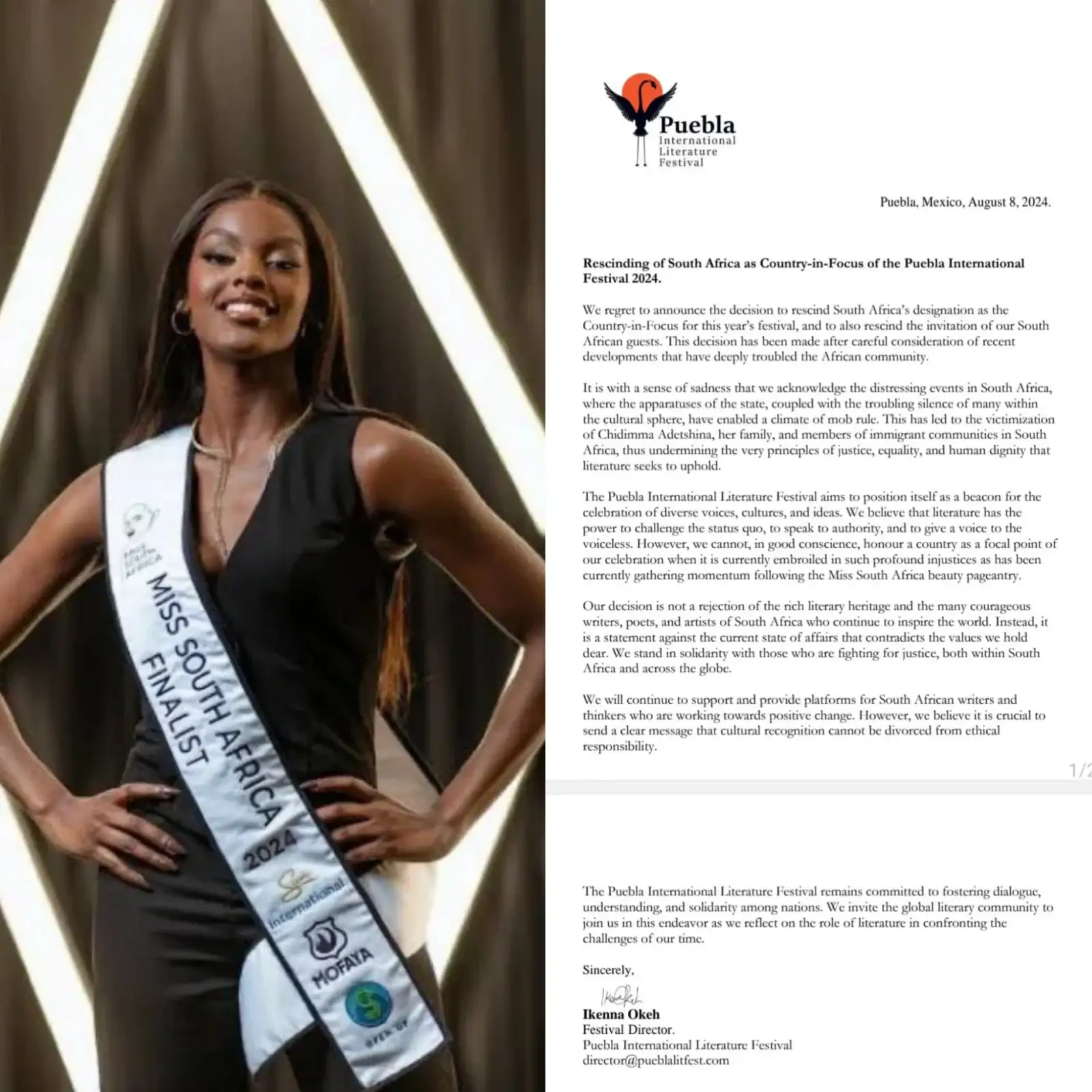 Puebla International Literature Festival has revoked South Africa’s status as the Country-in-Focus for the 2024 festival following the withdrawal of Chidimma Adetshina from the Miss South Africa beauty pageant.
