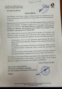 ‘’The Embassy has the honour to inform that the Ministry of Commerce and Industry in Qatar apologizes that it will not be able to hold a Business and Investment Forum as proposed by the Nigerian side due to the following reasons: Unfortunately, there is no any agreement signed between the State of Qatar and the Federal Republic of Nigeria on Investment Promotion and Protection. His Excellency the Minister of Commerce and Industry will be carrying out official missions outside the country during the upcoming visit period,’’ the letter partly read.