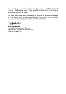 The petition for the recall of the Senator representing the Kogi Central Senatorial District has not met the requirement of Section 69(a) of the Constitution of the Federal Republic of Nigeria 1999 (as amended). Detailed statement shortly.