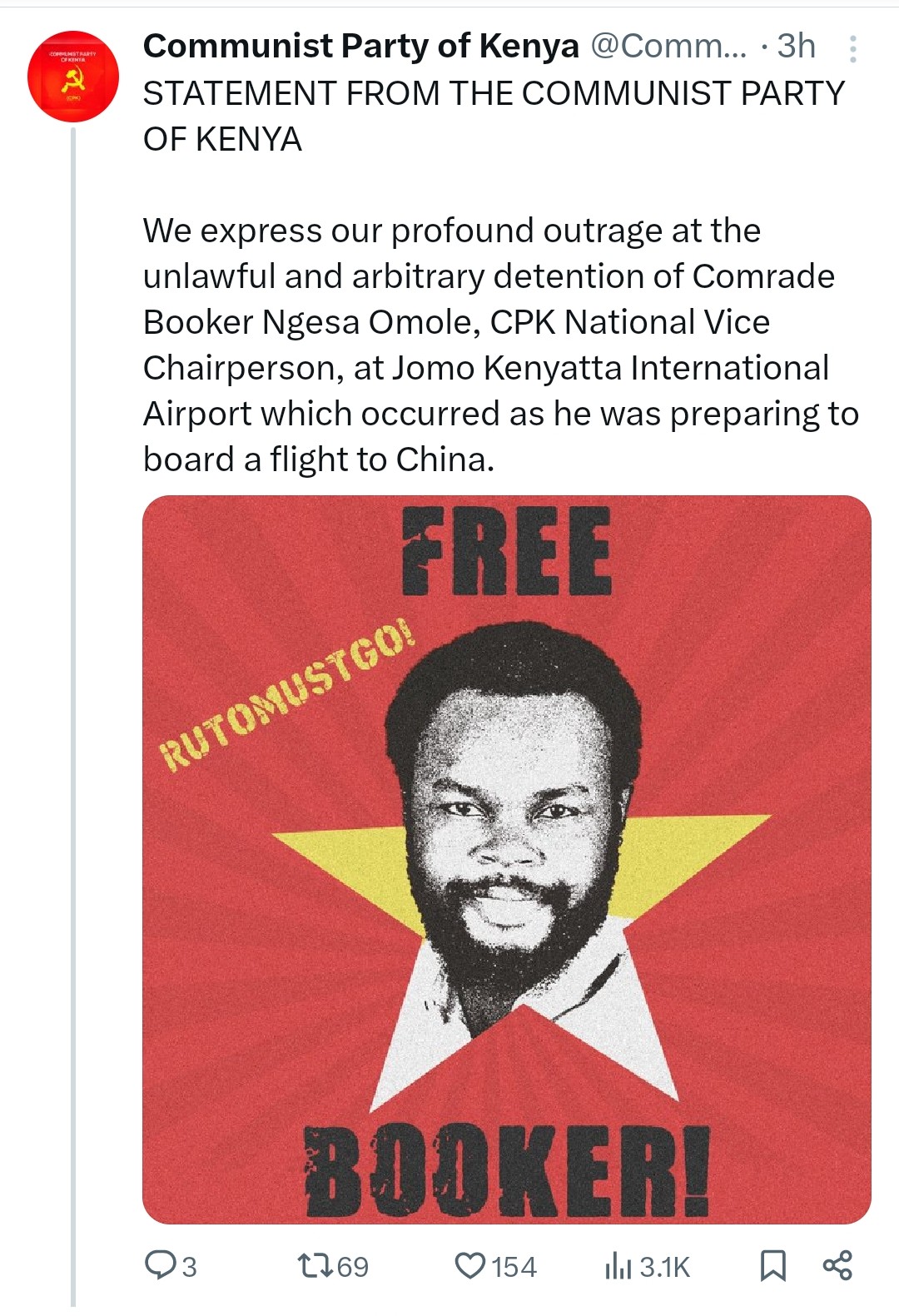 The national vice chairperson of the Communist Party of Kenya and one of the organisers of the protests against President William Ruto’s government, Booker Omole, was barred from travelling while preparing to board a flight to China at Jomo Kenyatta International Airport (JKIA), Kenya.