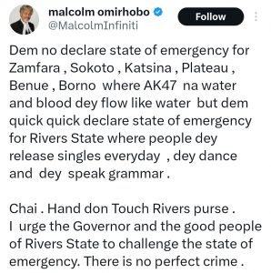 However, critics have highlighted the glaring inconsistency – why declare a state of emergency in Rivers, a state known mainly for its political disputes and economic vibrancy? In contrast, states like Zamfara, Sokoto, Katsina, Plateau, Benue, and Borno, where armed groups regularly massacre civilians, continue to operate without such drastic intervention.